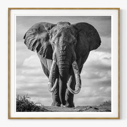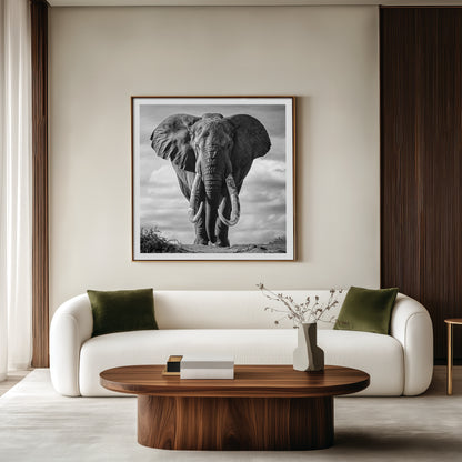 Experience the majestic power of 'Kratos,' a stunning black and white fine art print that captures the commanding presence of an elephant. This evocative artwork highlights the strength, wisdom, and dignity of this magnificent creature, making it a captivating addition to any space.